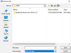 5. The “Print to File window” will open. Browse to where you would like to save the file, enter a file name and press Save to save the file. Ensure you select a Save as type of “Text Files” (otherwise you will not be able to open the file in Excel properly).