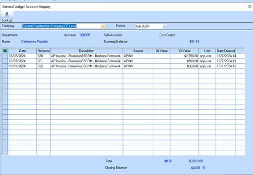 An enquiry into the General Ledger Retention Payable account in the General Ledger shows each of the retained amounts per transaction processed.
