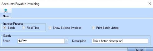 2. Select the Batch radio button for the Invoice Process field. The Batch Description field defaults to “Invoice Batch”. To ensure that it is unique and meaningful, amend the Description with additional text.