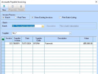 6. To amend an invoice within the batch, select the line item that requires changing and press the Properties button. The following window will be displayed: