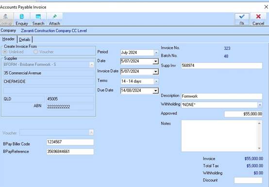 7. You may now amend any details of the invoice. To return to process the batch, select the OK button.