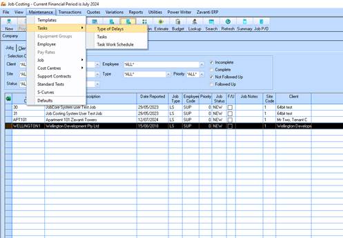 The Job Costing maintenance menu options from the main form of the Job Costing allows the user to access the maintenance functions relating to the Task functionality