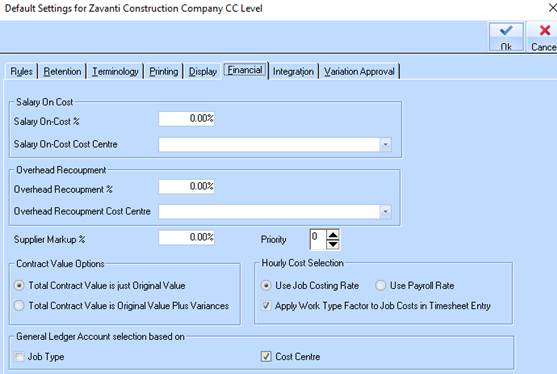 3. Set Financial defaults in Job Costing defaults Use Job Costing Rate & Apply Work type factor (if required ie if double time then the job cost will be multiplied by 2)