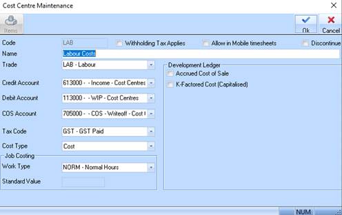 5. Ensure that all “Labour” cost centres have been linked to a default work type