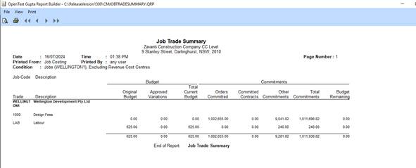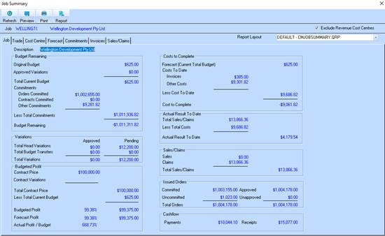 Job Costing and Contract Management modules have the function to allow the user to view the details of the selected Job at a Summary and Detailed level, both on the screen and in report format. The window, known as 'Job Summary', is available by selecting a Job on the main window of the Job Costing or Contract Management module and clicking the 'Summary' button.