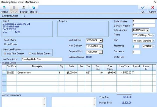8. Continue selecting Clients and entering the invoice details for all those applicable to this standing order run category.