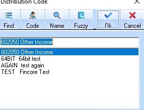 7. In the Distribution Code field select the Lookup button. The following dialogue box will be displayed: