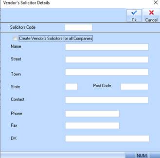 5. The Create Vendor’s Solicitors for all Companies checkbox will create the record in all Companies. Leave this deselected and press the Tab key.