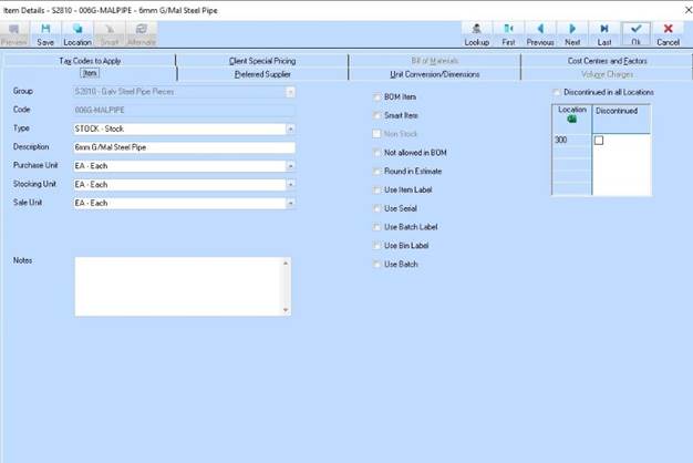 Any item that has different Units of measure need to have the Unit Conversion/Dimensions entered on the 3rd tab as shown below