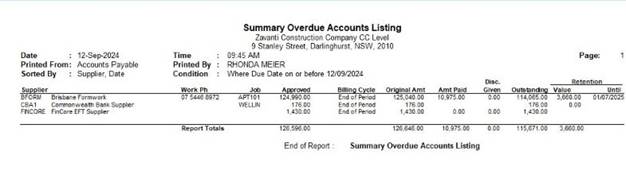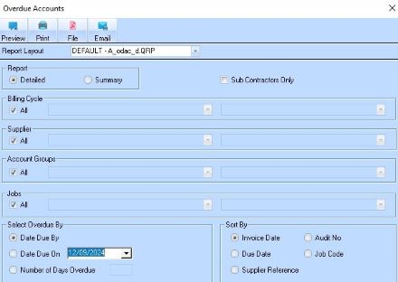 The Overdue Accounts report allows a user to display and/or print all details of any overdue invoices for Suppliers.
