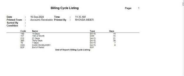 A user may want to print a list of allowable values for ease of reference. (Example: Billing Cycle used here)