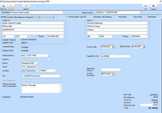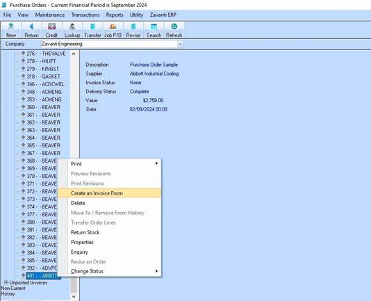 1. Right click on the Purchase Order and select ‘Create an Invoice From’