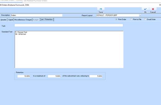 Retention percentages related to individual purchase orders can be maintained on the “Text/Retention” tab of the order.