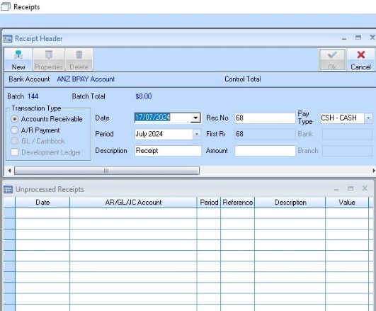 1. Select the Receipt icon or a menu path of Accounts Receivable Ø Transactions Ø Receipts. The following window will be displayed: