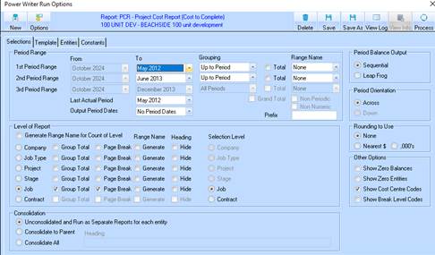 Specifying Run Options allows you to determine the company, estate stage or project you would like to run the report on. You can run a report on several of these entities. You can also choose the period dates for each period range of the report. The run options also allow you to specify advanced features of the report such as how range names are generated, how the report is totalled, the Excel template location, how the report data is entered into the template and so forth.