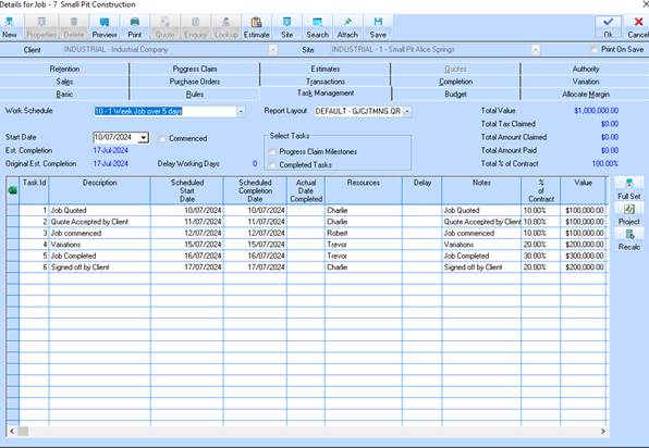 The ‘Completed’ check box on this table will also be used to flag, a task as being completed in order for it to be ‘claimed’ using the Task Management Claim functionality, if it is also flagged as a ‘Progress Claim Milestone’ task, shown here.