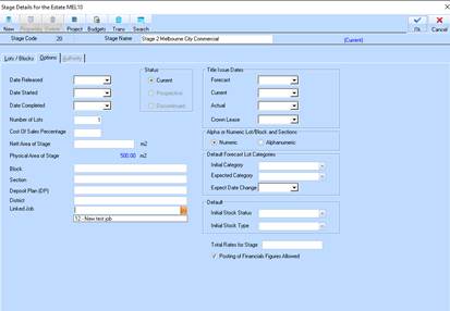5. If this a LAND Only stage, then go to the OPTIONS TAB on the Stage Maintenance and select the JOB created in Step 1, from the LINKED JOB selection and set the ‘Posting of Financial Figures Allowed’ check box