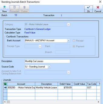 16. Enter a description and select source code. It is preferential that you have a unique source code for Standing Journals so they can be selected by type for reporting on the General Ledger Listing. If a unique code does not exist, right click on the field and select New. Enter the details, and then press OK to save the code. It can be maintained later via the Maintenance window in General Ledger.