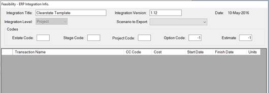 2. The Feasibility ERP integration selection window will appear. The user must enter the required fields (below) in order to create the necessary ‘export’ file details to be then used when importing into the ERP.