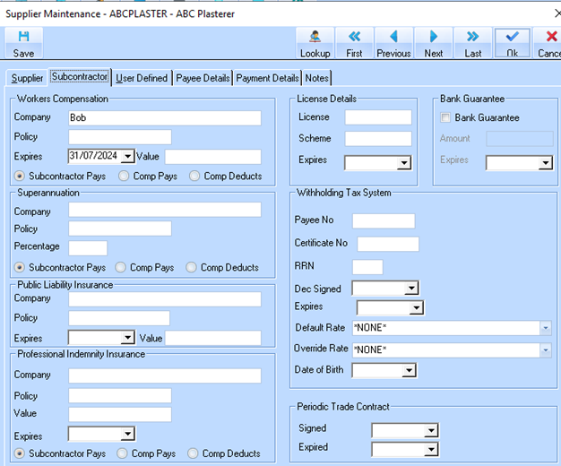 Accounts Payable set up for Subcontractors includes Professional Indemnity Insurance fields. Information that can be maintained includes: