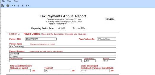 This report is NOT able to be submitted to the ATO. The ATO will not accept reports printed from any software application. Please refer to ATO website on the required form for submission to the ATO http://www.ato.gov.au/content/downloads/BUS00321342n74109.pdf http://www.ato.gov.au/businesses/content.aspx?doc=/content/00318229.htm |