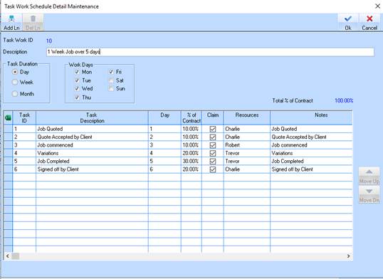 A percentage field (float) will be provided to enable the user to maintain a % against a Task(s) that shows what value of the contract for that the particular Task. This % value is used to automatically calculate the ‘Value’ of that Task at the Job level, based on the ‘Contract Value’ already maintained against the Job. The TOTAL of the % values entered on this Work Schedule Detail window MUST NOT EXCEED 100%. A message will be displayed if the user tries to SAVE a schedule and this Total % is > 100% |