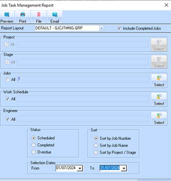The selection criteria, Engineer and Work Schedule will be added to the report selection window as shown will enable the user to filter Jobs Tasks by Engineer (Supervisor), and particular Work Schedules as maintained on the Job.