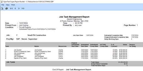 The Task Management report available from the Job Costing reports or by clicking the ‘Preview’ or ‘Print’ button from the Task Management TAB in the Job details window, or by selecting the ‘Job Task Report’ from the Job Costing reports menu, will provide a comprehensive job by job report of the task data able to be maintained by functionality described in this document.