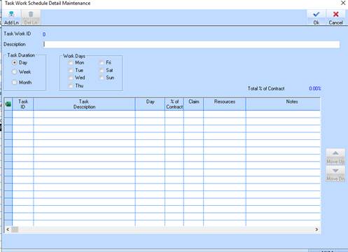 The maintenance window “Task Work Schedule Detail Maintenance” detail window, will allow the user to create new, and maintain existing Task Work Schedule Details