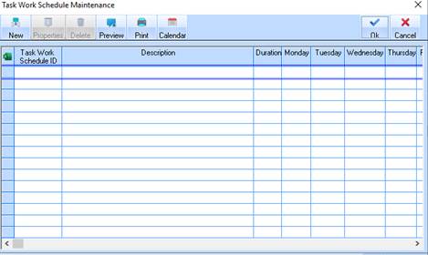 This option will call the ‘Task Work Schedule” Detail window to allow the user to create a NEW Task Work Schedule. |