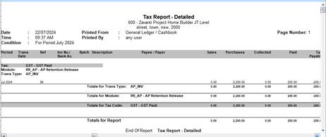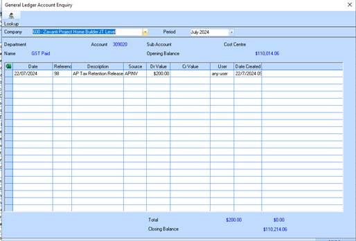 Tax Report Accrual Listing displays the Retention transaction at $200.00 which should balance to the GST Paid account in the General Ledger as shown below.