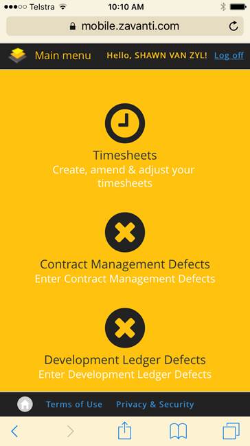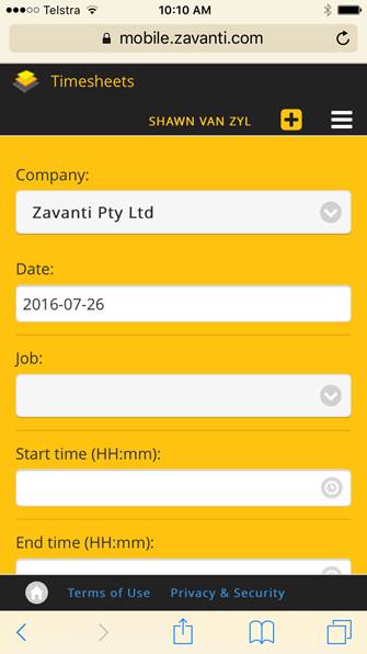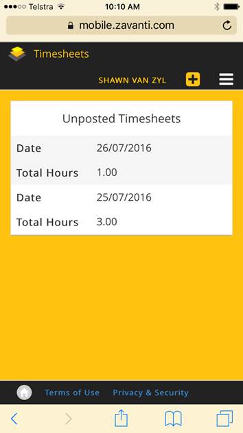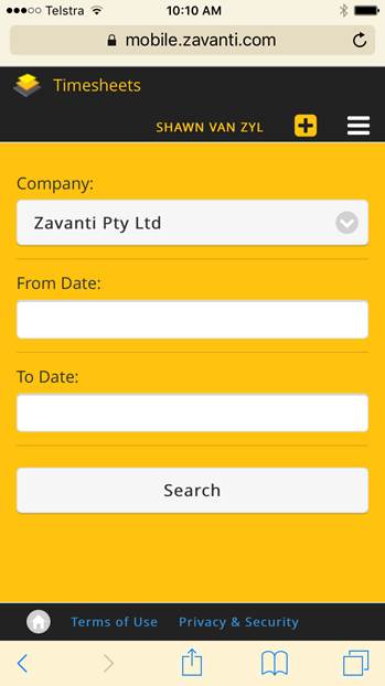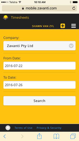 4. To enter a new timesheet the user selects the “+” button on the top menu from the search page or can access the menu drop down button.
