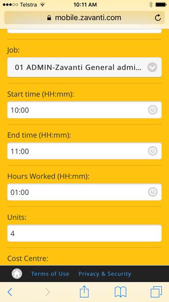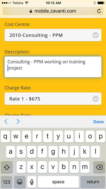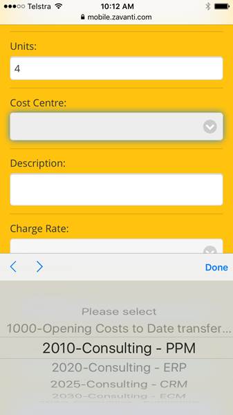 9. The next step is to select the work type (Cost Centre) from the drop down list which is displayed when the drop down in Cost Centre is selected. Once the relevant cost centre is highlighted select “Done” to save.