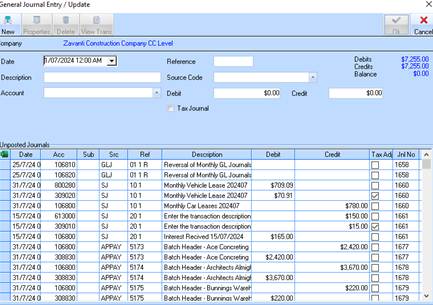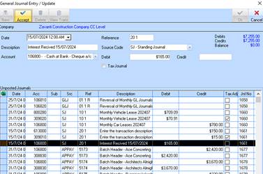 9. Update the information as required (either debit/credit figure, description or GL account) and press Accept