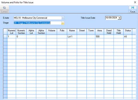 The assign volume and folio function allows you to change the basic information of a lot. When you get allocated the title to a group of lots in a stage you will need to set the Volume and Folio information on each lot. As well as making the changes to the group of lots you may need to send a letter to all those clients who have entered into a contract to purchase one of the lots from you advising them that the title is now ready and they need to settle in a certain number of days.