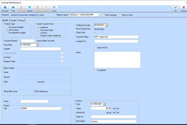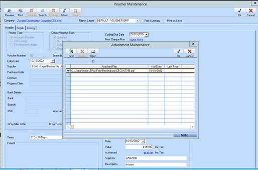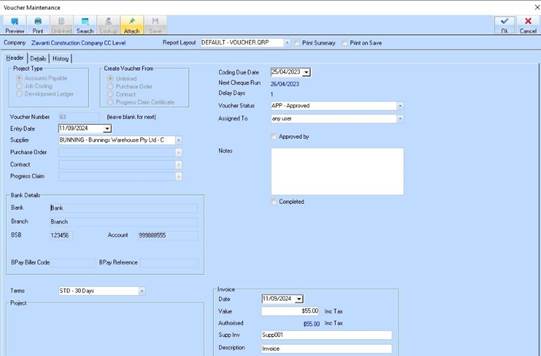 22. In the Authorise field, enter the amount of the Invoice. Press the Save button. Attach Document to Voucher