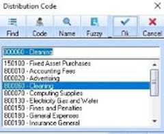 20. Select the Add Line button. The line will now be enabled for entering details of the invoice. The cursor will be positioned in the Distribution field. Select the Lookup button. The Distribution Code list will be displayed as follows: