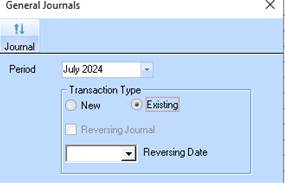 2. Select the relevant period and click on 'Existing' to view the current entries. Click on the Journal button in the top left corner to view the details.