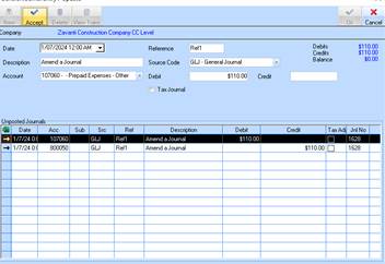 9. Click OK on the following message. Note the ACCEPT button on the Journal screen Top LHS.