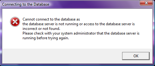 Zavanti ERP uses SQLBase as a means of communicating with the database to retrieve and insert data. If the software loses the connection with the database, the user will get an error message similar to the following, stating they cannot connect to the database: